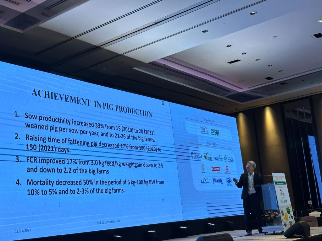 Furthermore, the time it takes to rear pigs for sale is about 180 days on small farms, while larger operations can cut this down to 150 days. There is also a notable difference in feed conversion ratio (FCR), with small farms operating at 3.0 and larger farms at around 2.2, although Prof Kinh did not clarify whether this distinction pertains to home-mixed feed versus industrial feed.