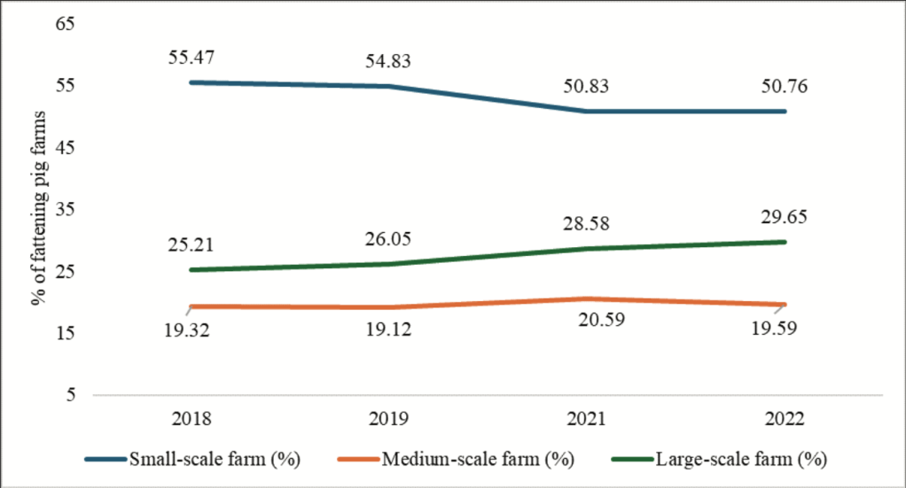 Các trang trại lớn có chi phí thức ăn, nhân công và sản xuất thấp hơn so với các trang trại nhỏ, nhưng họ lại chi nhiều hơn cho thuốc men. Các trang trại quy mô vừa thường có chi phí thấp hơn ở hầu hết các hạng mục so với cả trại quy mô lớn và quy mô nhỏ, nhưng chi phí thuốc thú y lại cao hơn hết. Mặc dù số lượng trang trại lớn đang tăng lên, số lượng trang trại quy mô vừa lại ổn định hơn, không thay đổi nhiều.