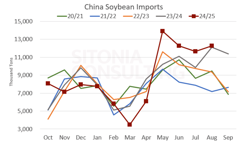 Thứ nhất, Trung Quốc dự kiến sẽ có một vụ mùa đậu nành kỷ lục trong năm nay vì điều kiện thời tiết thuận lợi. Giá đậu nành trồng tại Trung Quốc vào giữa tháng 9 đã giảm xuống mức thấp nhất kể từ tháng 4.